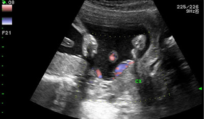 (同上例)再經腹部超音波檢查可見其臍帶與胎盤連接的位置在子宮下段,臍帶在離開胎盤後先爬行於子宮壁再附著於子宮頸內口的情形。
