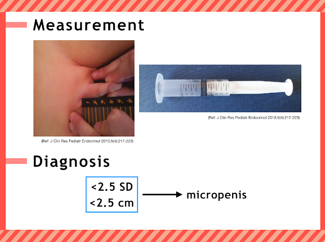 產前胎兒陰莖大小評估方式很多種,像是海綿體長度、陰莖長度、陰莖寬度、陰莖體積的測量,陰莖勃起是陰莖長度測量的干擾因素,有文獻認為增加陰莖寬度的測量有助於評估 micropenis,因為陰莖是管狀結構,所以該文獻假設 micropenis 除了短之外,寬度也會比較小。